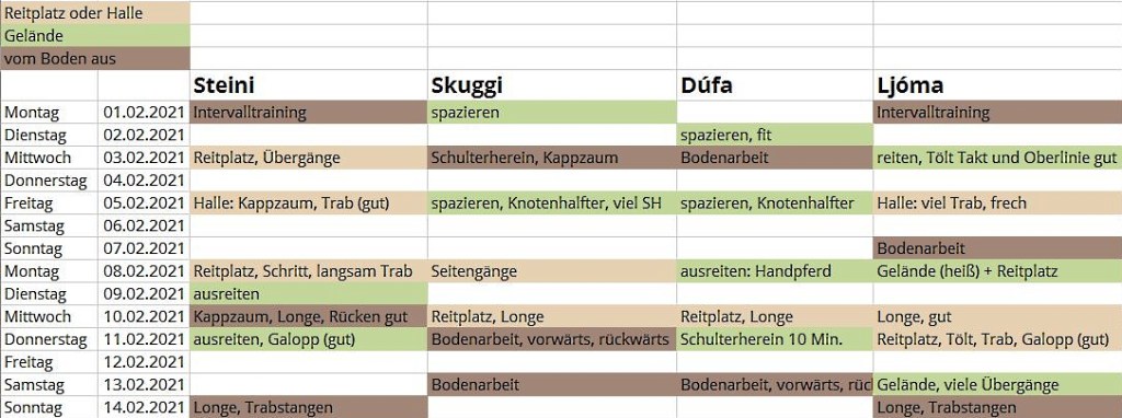 Ich versuche alle Pferde mindestens jeden zweiten Tag zu arbeiten. So haben sie eine gewisse Kontinuität und mir fällt es so leicht den Überblick zu behalten. Oft trainiere ich das Pferd zuerst, das eh schon mit raus möchte oder trainiere das Pferd zuerst, das in den Tagen davor etwas zu kurz kam. Für mich selbst dokumentiere ich das Training in der einer Exceltabelle und versuche abwechslungsreich und vielseitig zu trainieren. Dazwischen haben die Pferde immer wieder genug Zeit sich psychisch und physisch zu regenerieren. Ich habe die Erfahrung gemacht, lieber investiere ich mehr Zeit und Fokus auf gute Trainingseinheiten als um jeden Preis jedes Pferd jeden Tag zu trainieren.