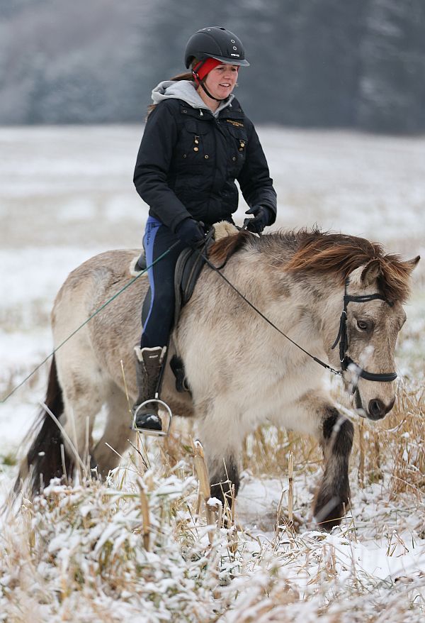 Mit einer Mischung aus geraderichten und Dressur, lockerem vorwärtsreiten im Gelände, longieren am Kappzaum und Bodenarbeit sind gerade alle Pferde fit und fröhlich.